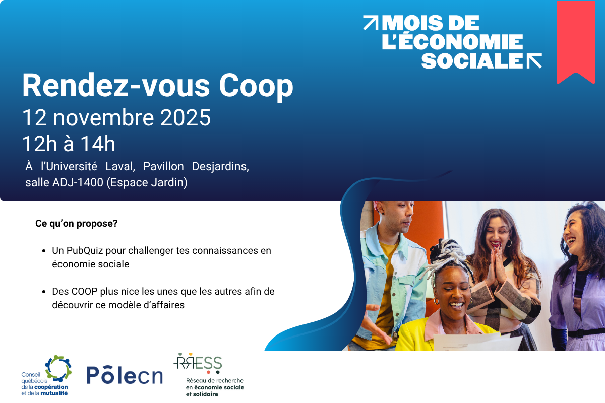 Le CQCM, le Pôle CN et le RRESS vous invitent à participer au Rendez-vous Coop. Cet événement a pour objectif de démystifier le mouvement de l’économie sociale et de le faire découvrir aux étudiants postsecondaires de la région de Québec.